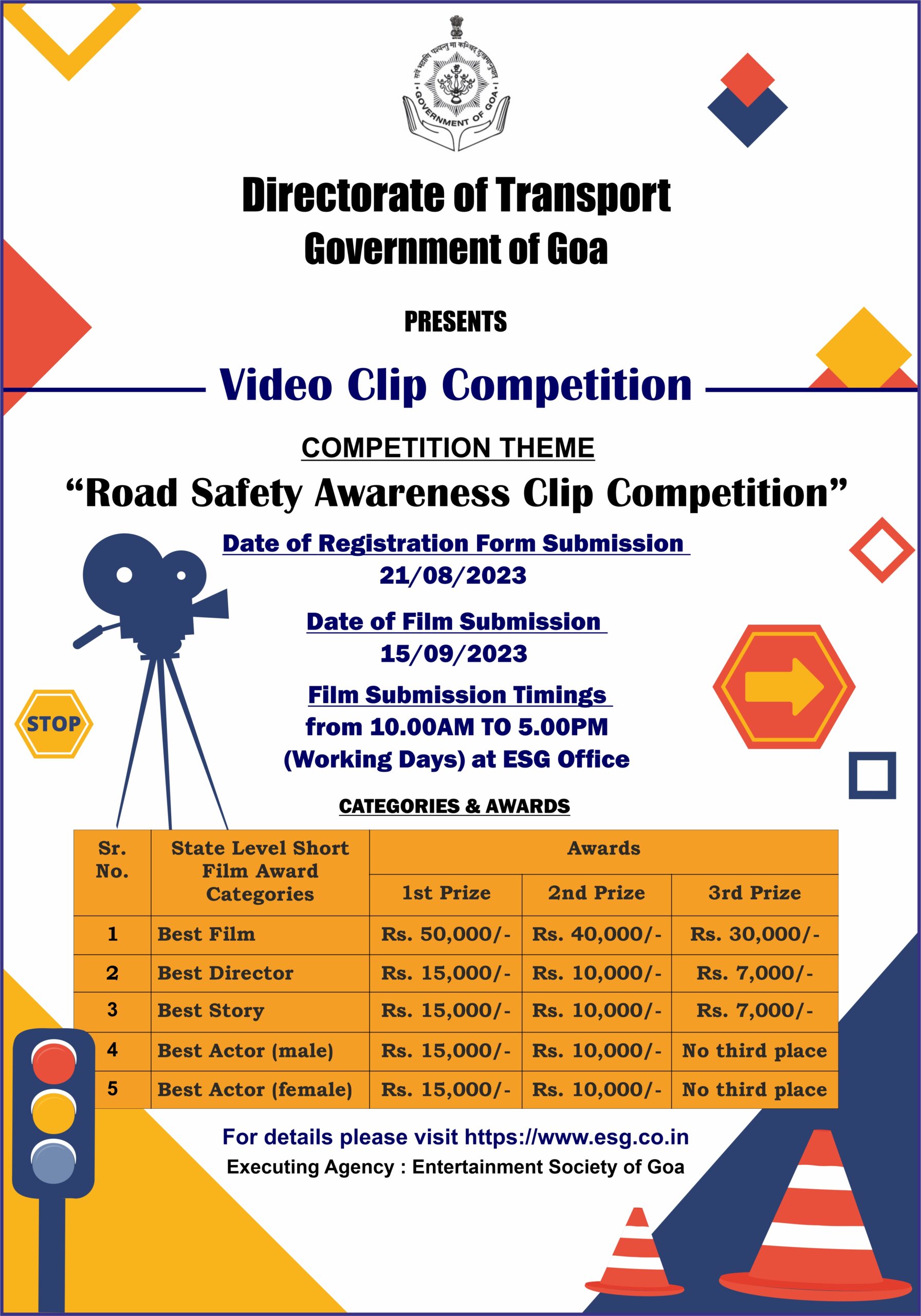 The aim of the “Road Safety Awareness Clip Competition” organized by the Lead Agency, Government of Goa is to create awareness to all road users and public in general, taking into consideration the ever growing population of various types of Motor Vehicles on the road.